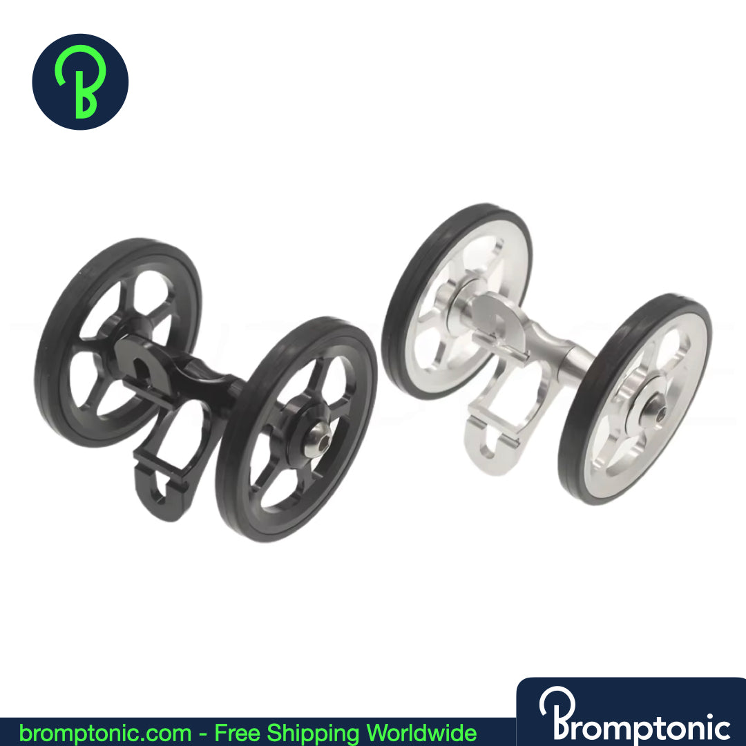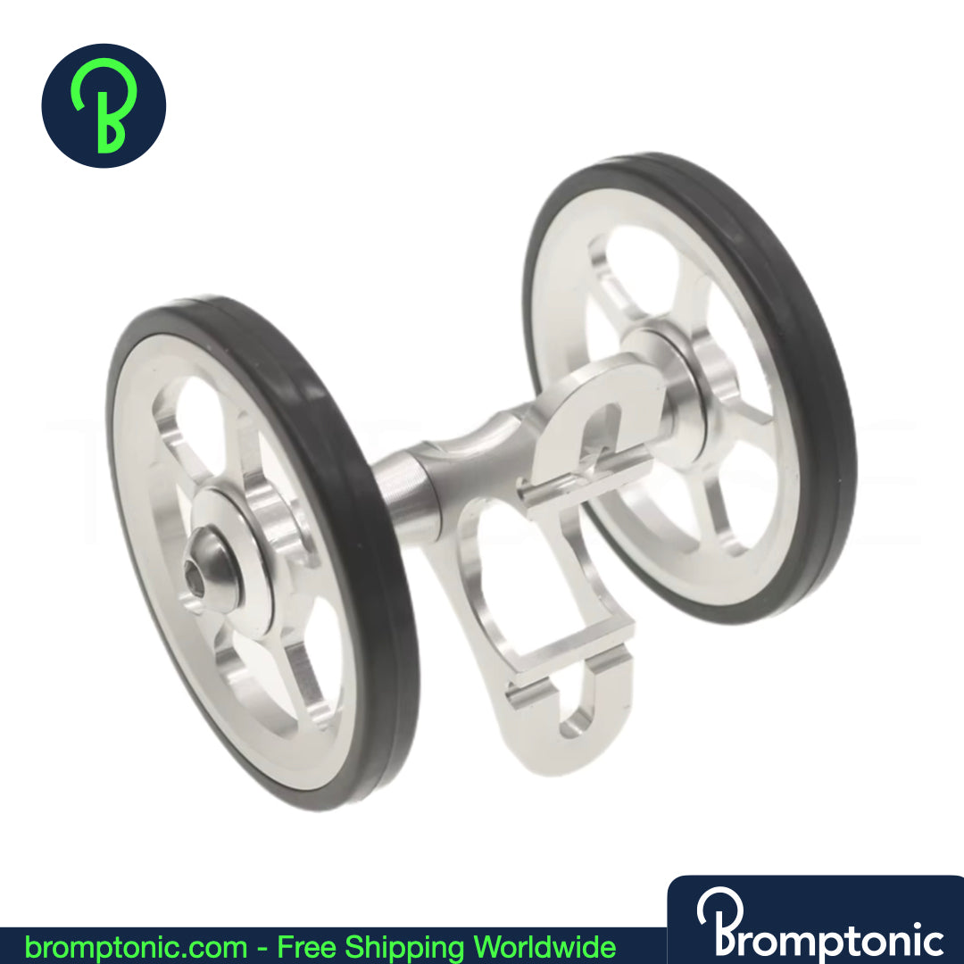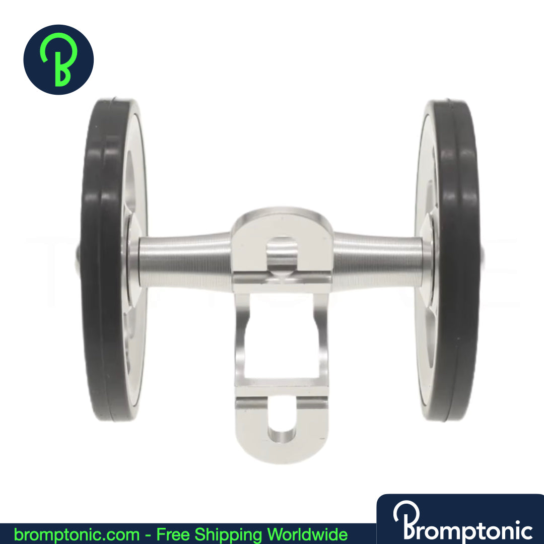 A significant upgrade over the stock plastic mudguard wheel. This double easywheel is CNC machined from AL7075 aluminium with a rubber tyre — smoother rolling, better stability, and a cleaner look when your Brompton is folded.