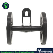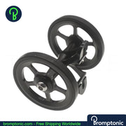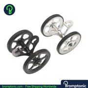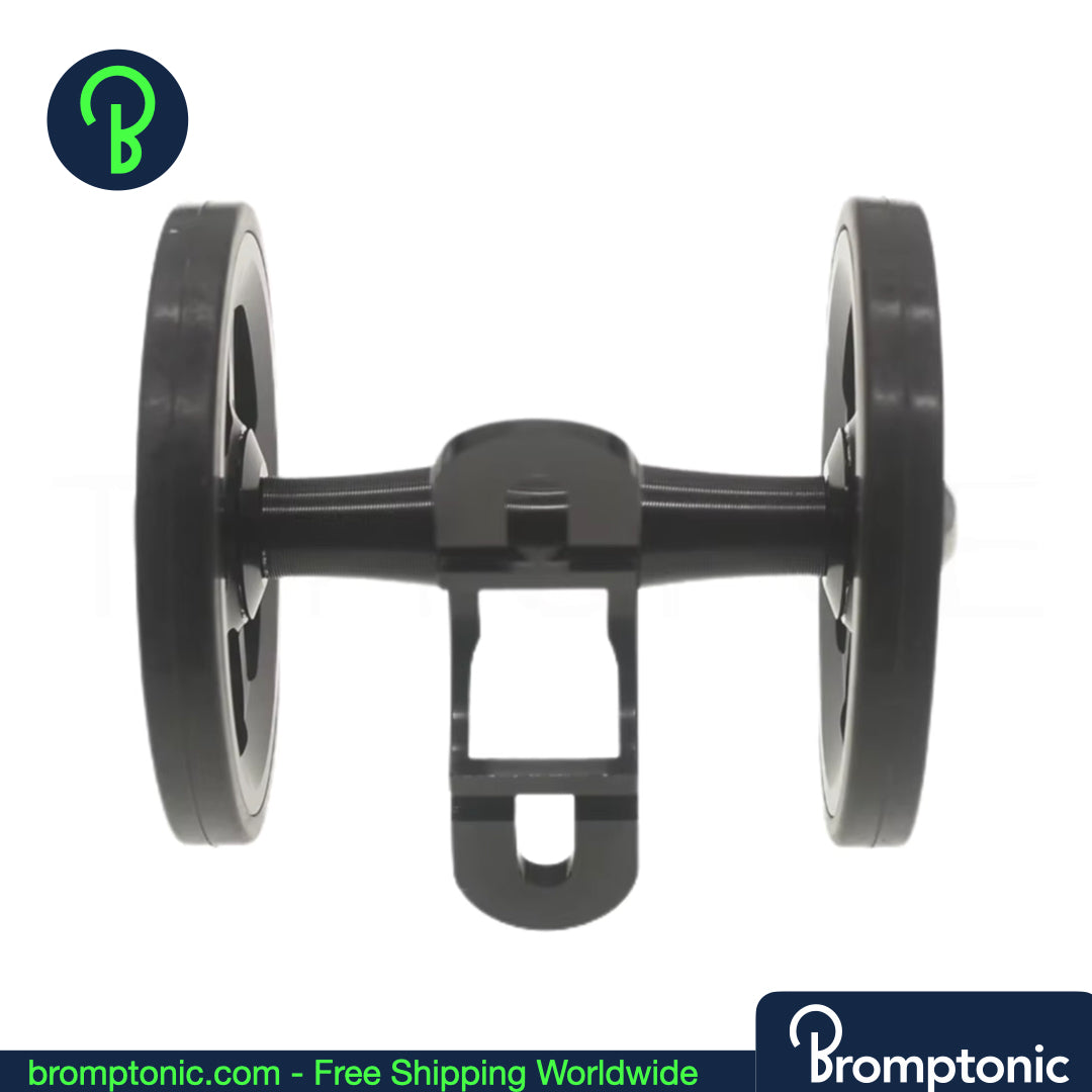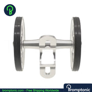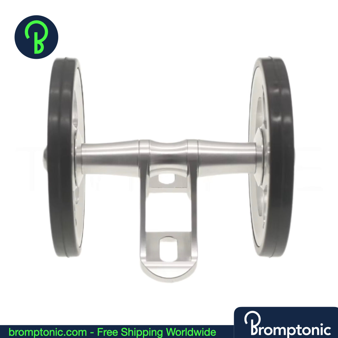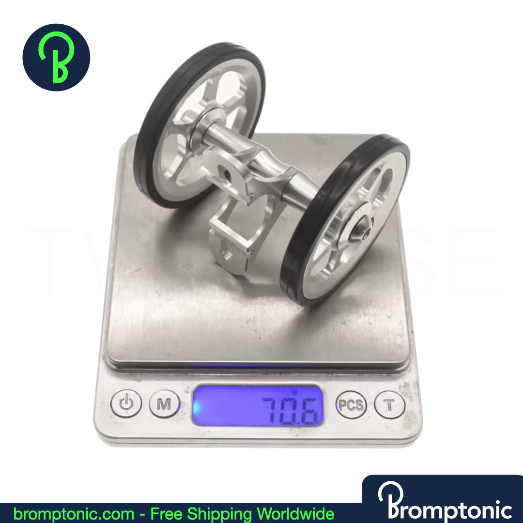 A significant upgrade over the stock plastic mudguard wheel. This double easywheel is CNC machined from AL7075 aluminium with a rubber tyre — smoother rolling, better stability, and a cleaner look when your Brompton is folded.