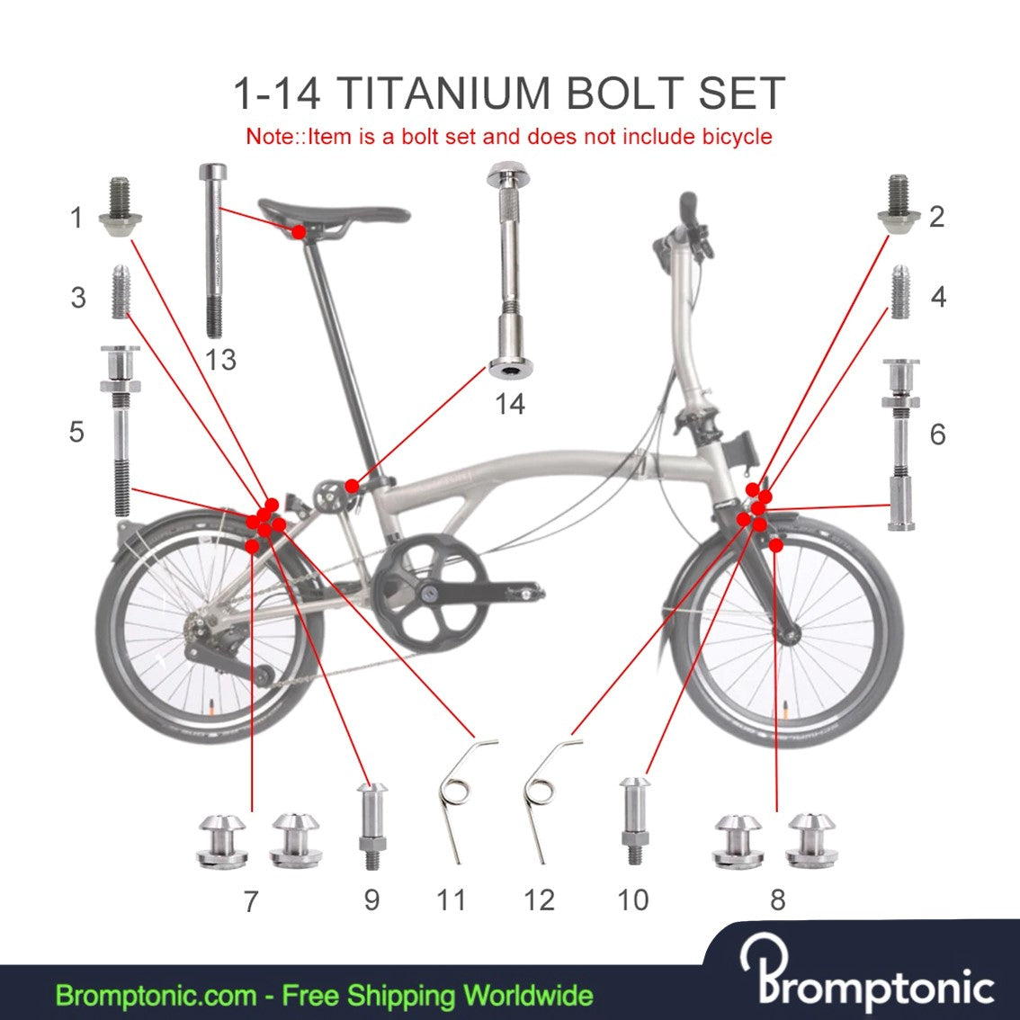 고강도 6AL/4V(5등급) 티타늄 합금으로 제작된 프리미엄 티타늄 볼트 세트로 브롬톤 P 라인 또는 T 라인을 업그레이드하세요. 무게를 줄이고 부식을 방지하도록 설계된 이 완벽한 세트에는 브레이크, 안장 클램프, 헤드셋, 리어 쇼크, 허브에 필요한 모든 필수 볼트가 포함되어 있습니다.